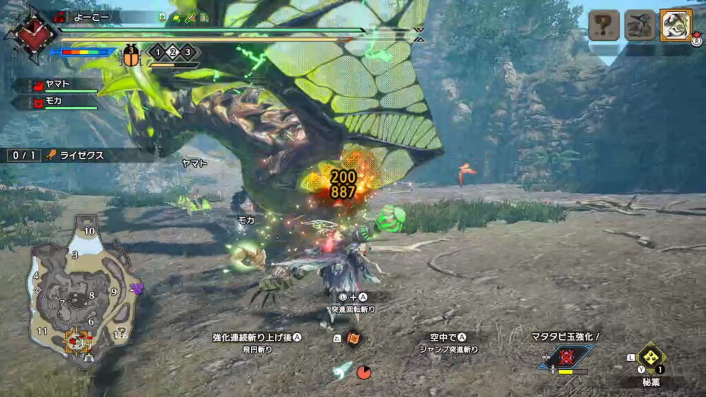 この攻撃は「降竜」と違って翔蟲ゲージを消費せずに攻撃できる技なので、かなりの強化といえるかと思います。今までと違い猟虫はエキスを取ってくるだけの存在ではなく、一緒に戦ってくれる心強い仲間となりました(いままでもそうでしたが・・・よりってことです)
