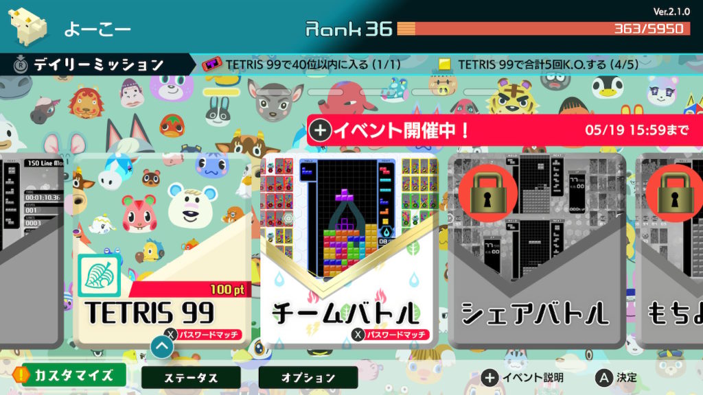 そんな【テトリス99】と【あつまれ どうぶつの森】のコラボということで、イベントに参加して条件を満たすことができれば、イベント限定のテーマをゲットすることができます。