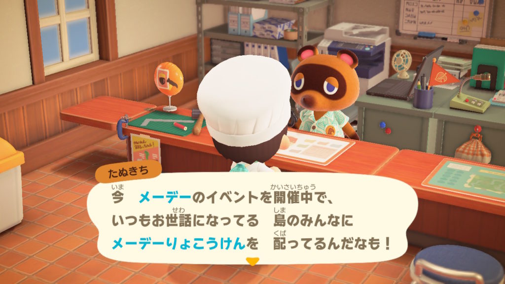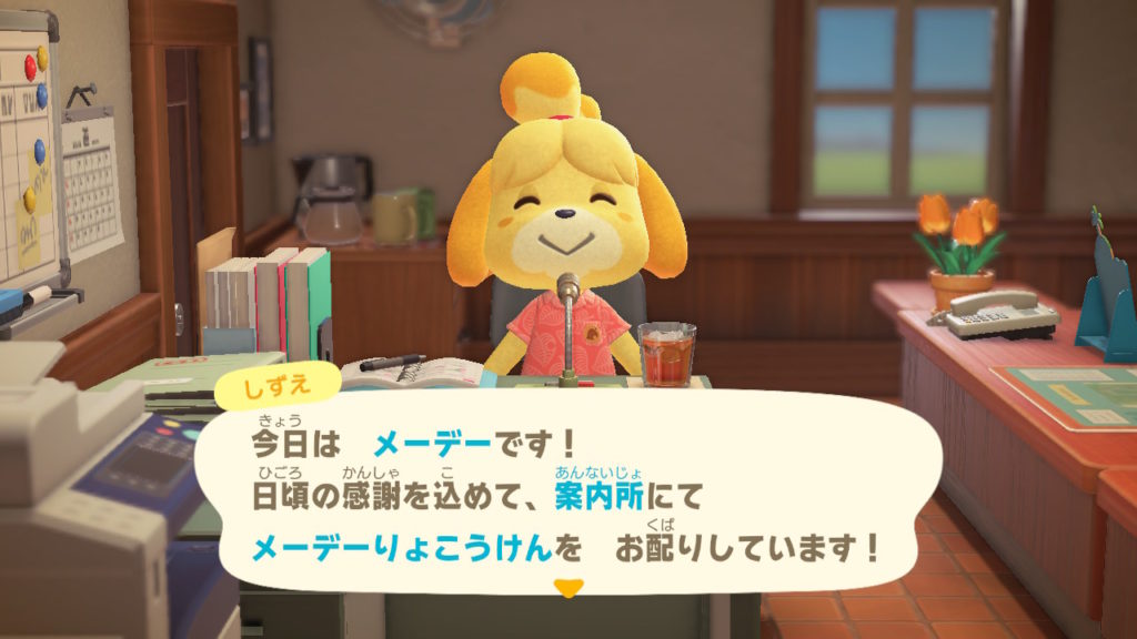 しずえさんの島内放送でも教えてくれますが、案内所でたぬきちに話しかけるともらうことができます。