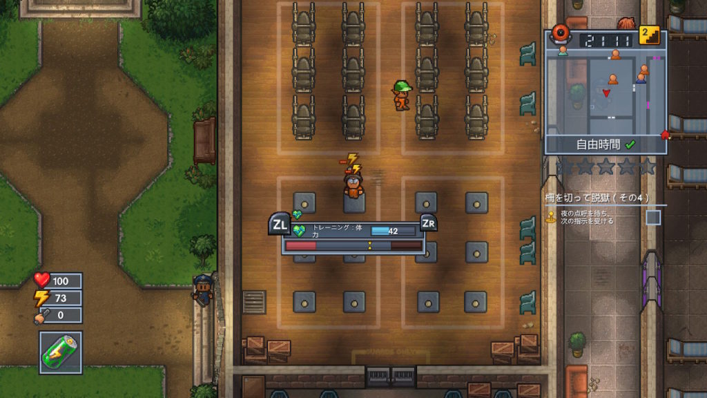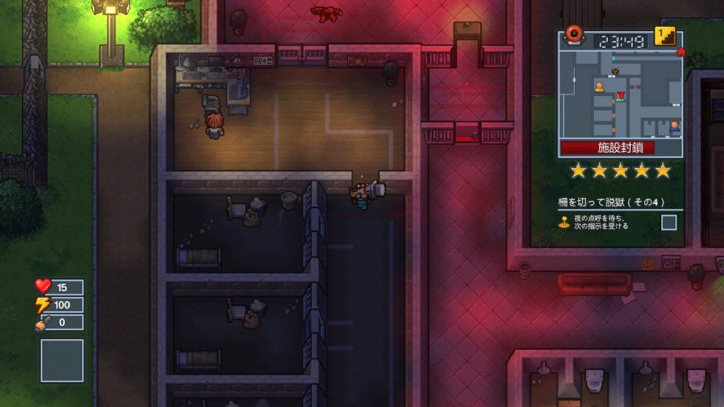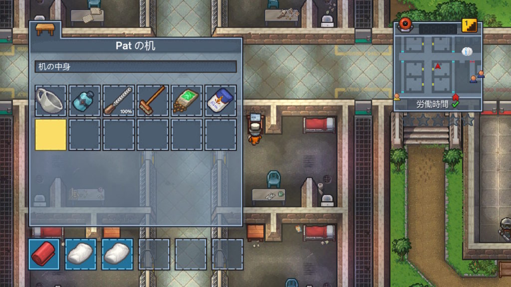 刑務所内では割と自由に動ける時間が多く、日課もその場所まで行けばクリアになるので顔だけ出したらあとは自由行動という破格の緩さなので、その中で脱獄に必要なアイテム集めや準備を進めていきます。